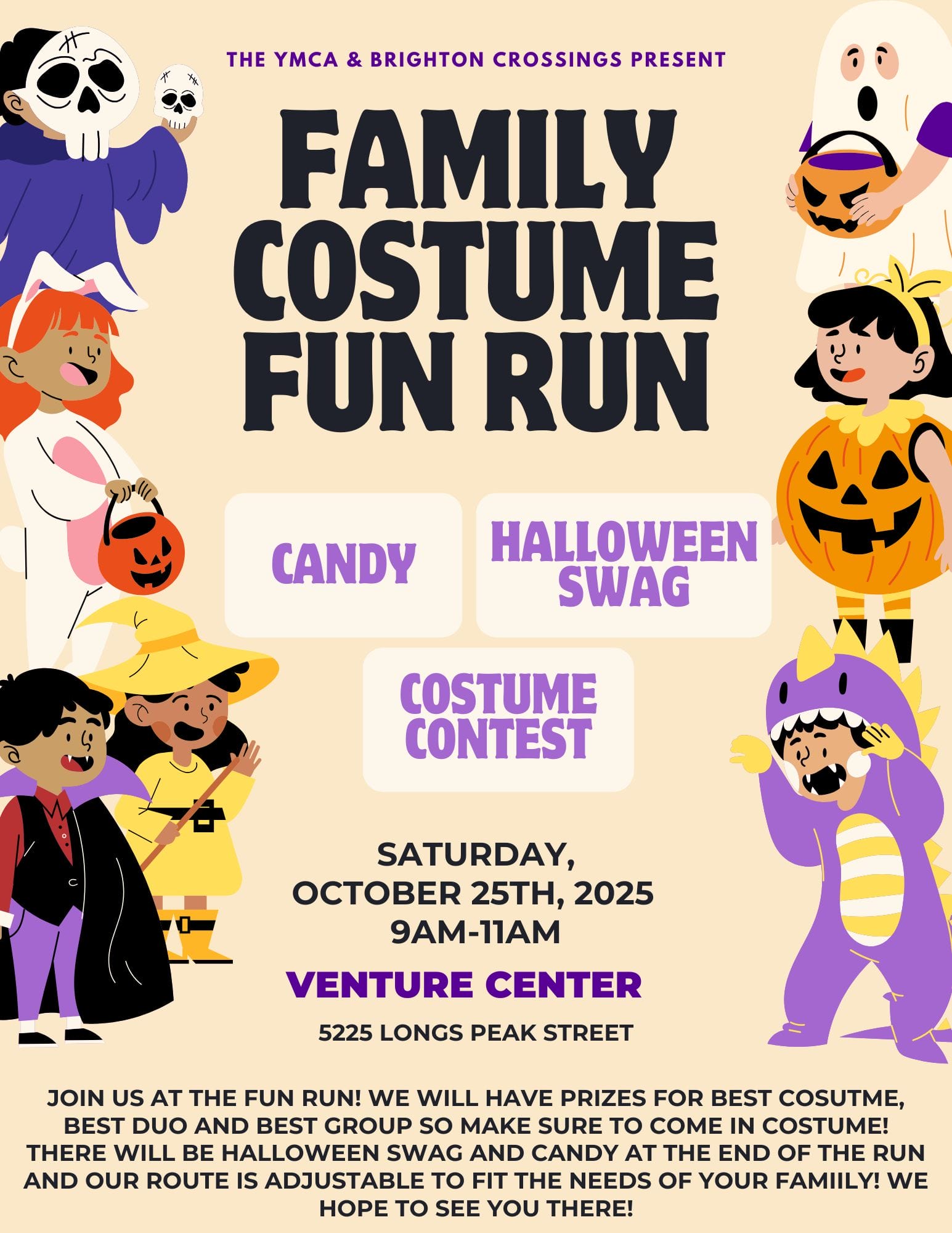 Join us for a Family Costume Fun Run! Our route will be 2 miles near the Venture Center that can easily be adjusted to a 1 mile loop for a shorter walk or for kiddos. We will have candy stations, halloween goodies, and prizes for best individual, pair, and group costumes! You won’t want to miss this family friendly activity! Everyone is welcome to join the fun, just come dressed in your best costume and running shoes!